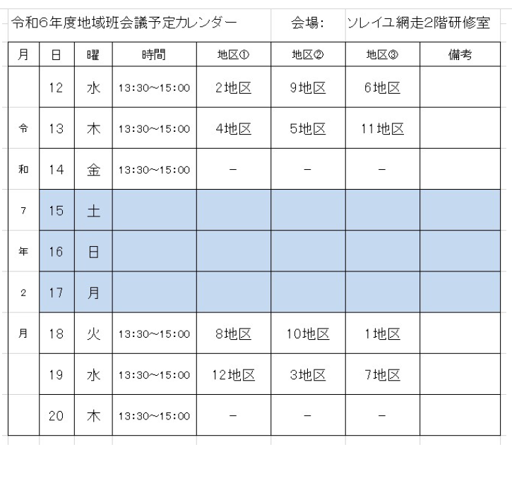 令和6年度地区班会議日程表